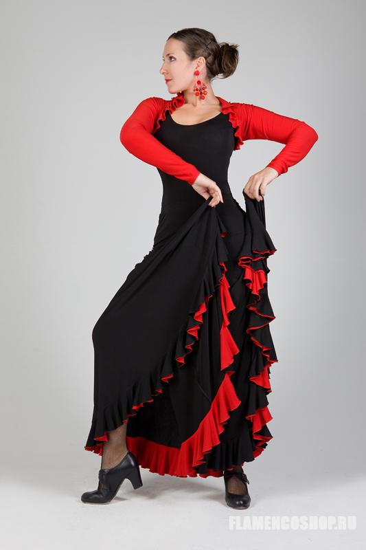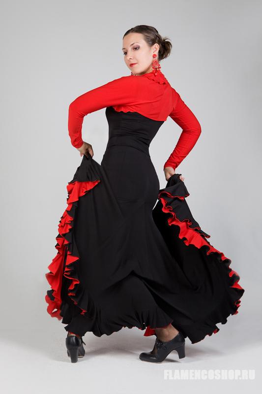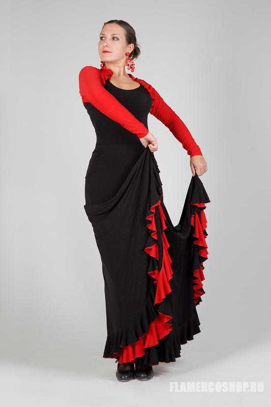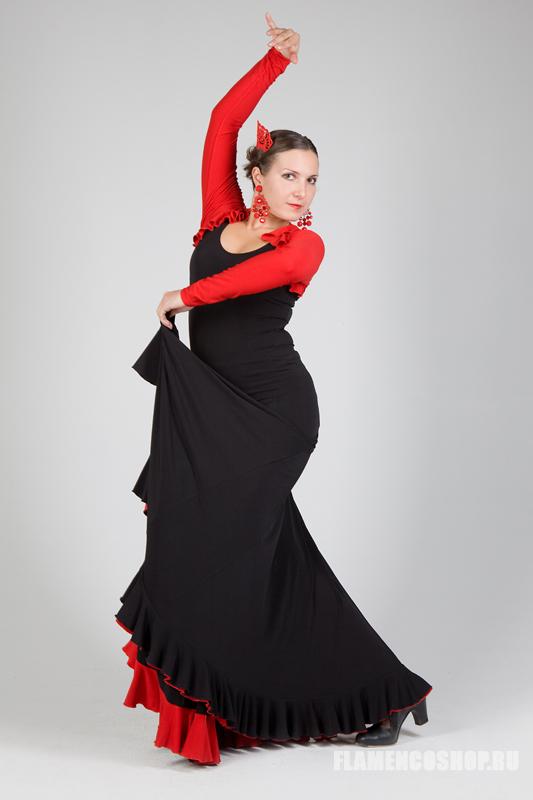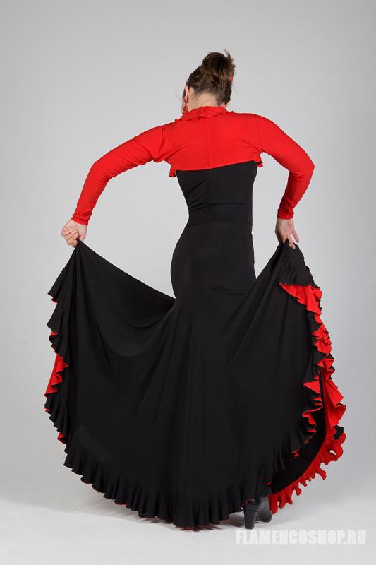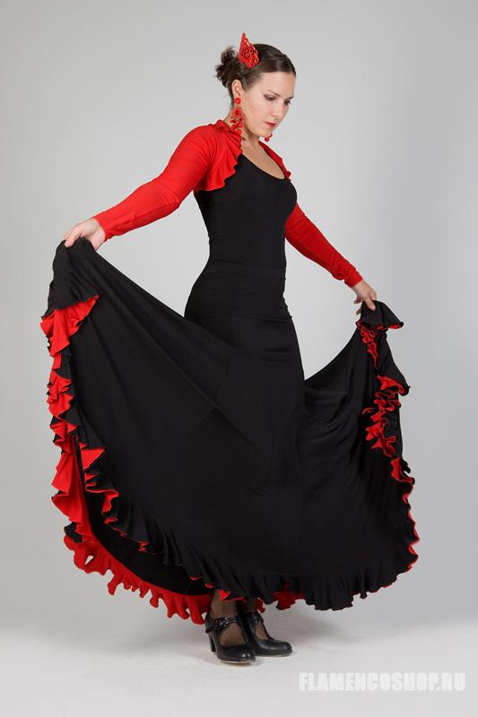Эта модель юбки для фламенко используется тогда, когда необходимо активно работать с юбкой, её особенностью является широкий клёш. У этой юбки есть большой плюс: уровень вшивания клиньев можно регулировать в зависимости от формы бёдер, поэтому она подходит всем, независимо от особенностей фигуры. Юбка достаточно тяжёлая (2 волана), поэтому мы делаем её на обыкновенном 3 см поясе с резинкой., так как с широким мягким поясом она будет сползать вниз.