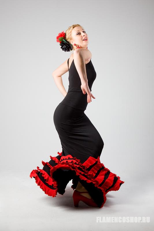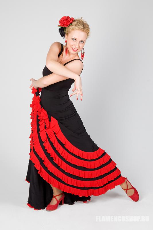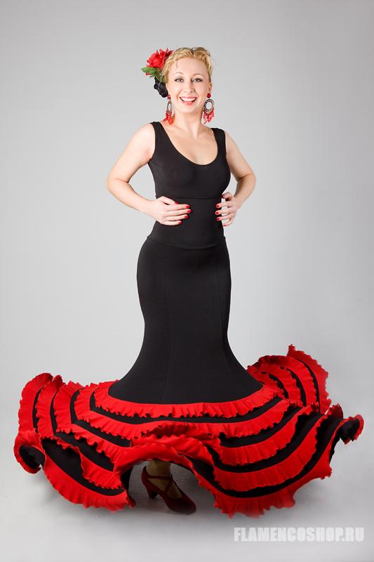 Основой юбки является базовая 6-клинка годе, хорошо расклешеная от колена (см.Lusia), на которую пришиваются 5 уровней маленьких воланчиков. Эта юбка супер популярна и востребована у танцовщиц фламенко уже несколько сезонов, входит в топ-10 продаж. Воланчики могут быть как из трикотажа (как на фото), так и из кружева или даже шифона.
