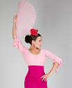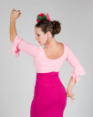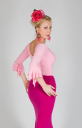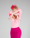 Боди двухслойное из трикотажа с круглым вырезом по переду и спинке, рукав 3/4. Низ рукава украшен 2 воланчиками со свисающими концами. Застёжка внизу на ленте с крючками.