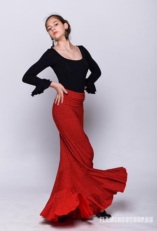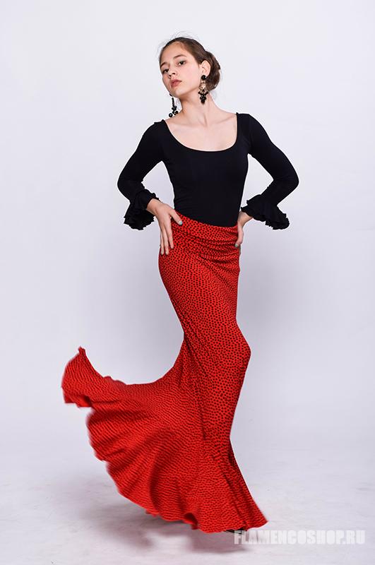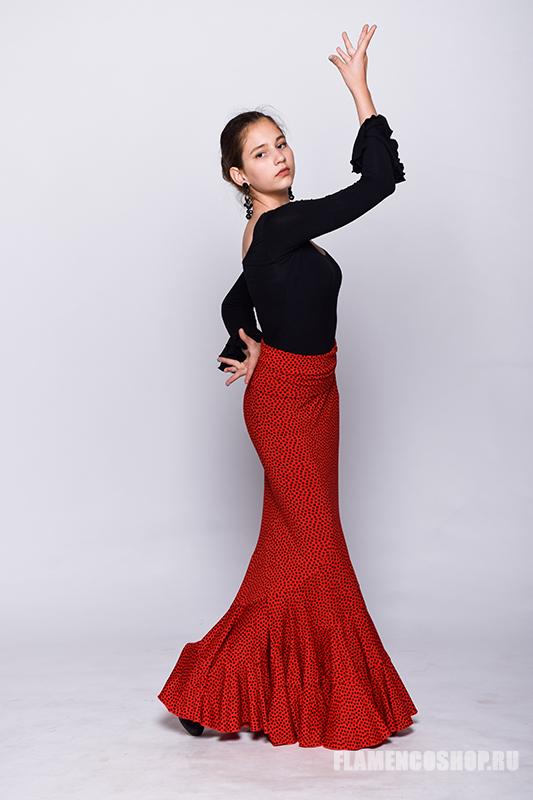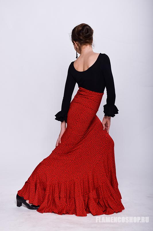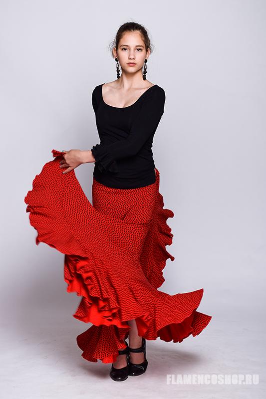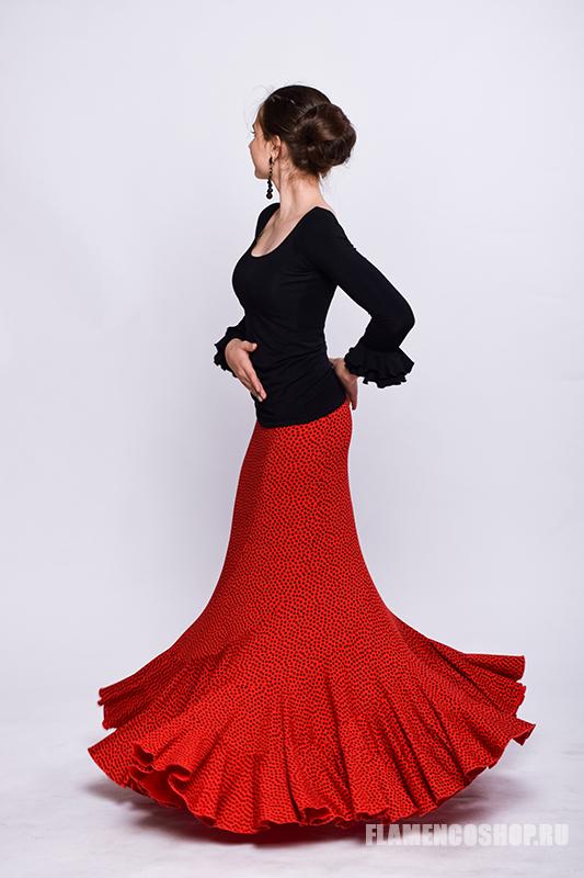 Юбка на мягком широком поясе, раскрывается в танце как цветок за счет своего винтового кроя (5 клиньев) и дополнительного большого волана.